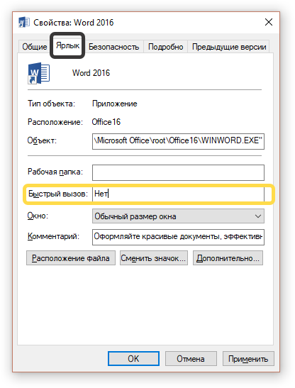 Возьмём простой пример — у вас на столе есть ярлык программы Microsoft Word. Каждый раз, чтобы открыть редактор, вы сворачиваете остальные окна и ищите взглядом этот ярлык среди множества других. Но всё можно организовать гораздо проще. Для этого необходимо правой кнопкой мыши нажать на ярлык, в самом низу открывшегося контекстного меню кликнуть на пункт «Свойства». Откроются свойства этого ярлыка, где есть нужная нам строчка «Быстрый вызов». Поставьте внутрь строчки курсор и нажмите клавишу с любим символом на клавиатуре. Теперь по сочетанию клавиш «Ctrl + Alt + <ваш>» программа или файл будут моментально открываться. Например, для Word я выбрал «Ctrl + Alt + W» в надежде, что запомнить будет проще. Также доступны цифры (но цифры с верхнего ряда и цифры с цифрового блока с права от клавиатуры — разные цифры) и клавиши F1-F12.