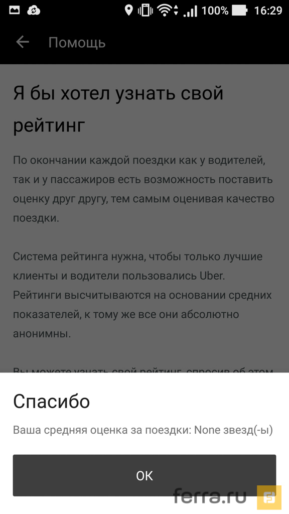 - Нажимаете клавишу «Отправить» и сразу видите среднюю оценку по итогам всех ваших поездок. Если вы ездили на Uber слишком редко/давно, у вас может попросту не быть рейтинга, о чём приложение честно известит вас словом «None».