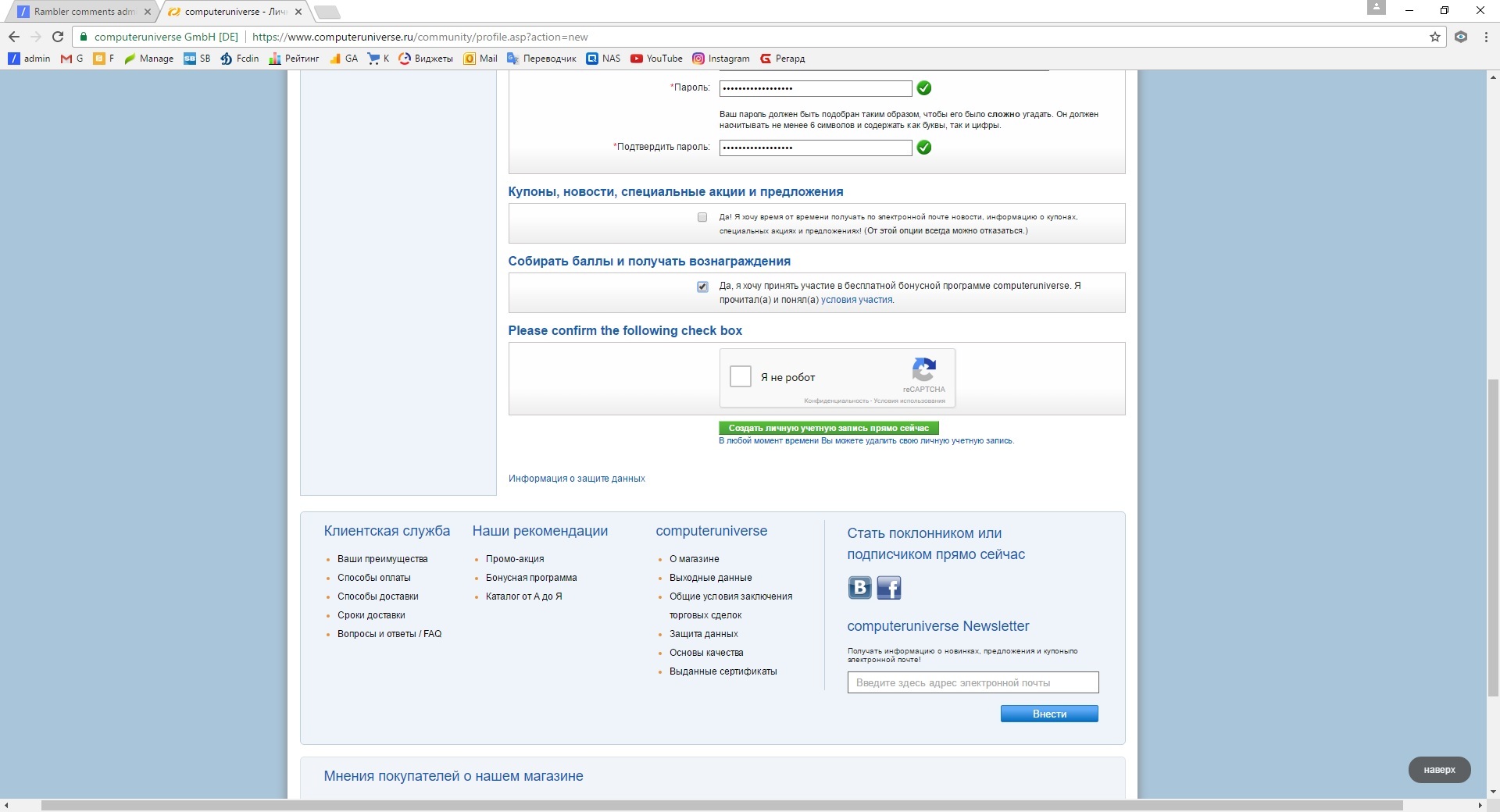 Регистрация на сайте Computeruniverse