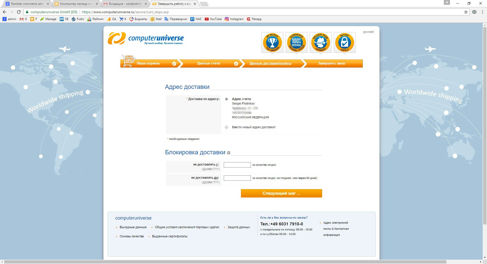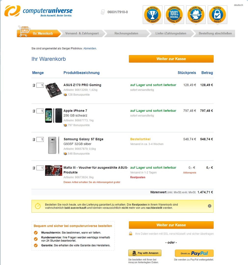 Третий момент — не все банковские карты срабатывают. Иногда оплата не проходит. Это проиcходит, например, из-за несоответствия данных держателя карты и данных аккаунта магазина Computeruniverse. Они должны совпадать.