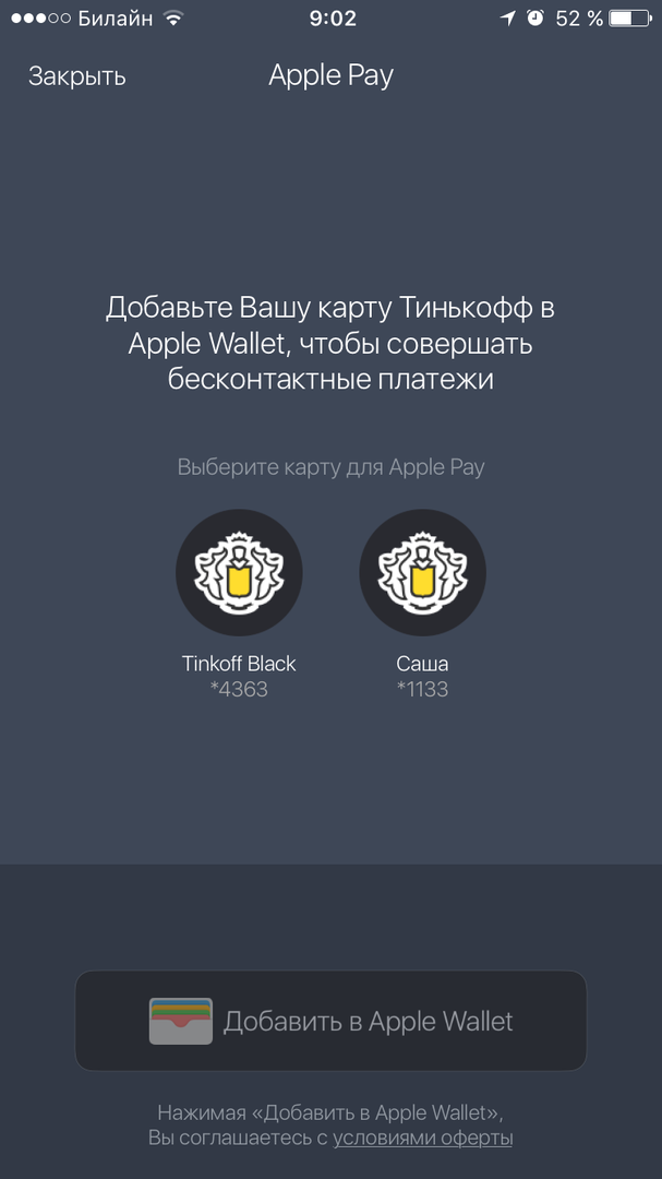 3. При запуске приложение обрадует вас новостью об Apple Pay и предложит сразу подключить карты к системе. Это можно сделать и через меню: выбрать в списке счетов вашу карту, нажать на многоточие в правом верхнем углу, нажать кнопку «Услуги» и, наконец, для нужной карты нажать «Добавить в Apple Wallet». Собственно, Apple Wallet («бумажник» — англ.) — это предустановленное в iPhone приложение, в котором собраны все подключенные банковские карты, карты лояльности, карты авиакомпаний, билеты в кино и т. д.