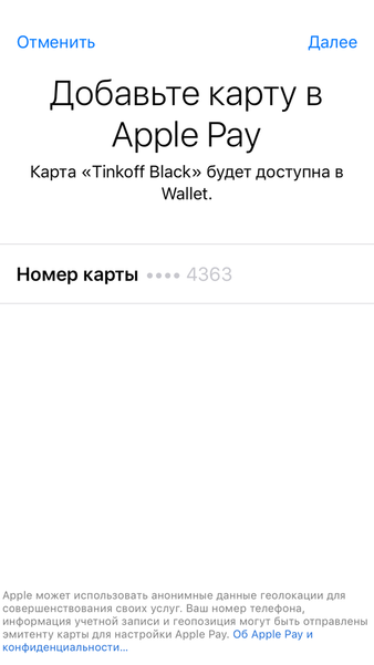 4. Осталось три клика. Проверьте по последним цифрам номера карты на экране, что добавляете «ту самую» и нажмите «Далее». Примите (ну хорошо, прочтите и примите) правила. Приложение свяжется с банком, банк свяжется с Apple, и через 5–10 секунд вы увидите сообщение «Карта добавлена». Жмите «Готово» — и бегом в магазин.
