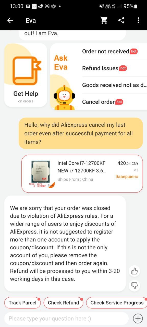Через несколько минут Aliexpress отменяет ВСЕ заказы по этой оплате с формулировкой «для безопасности аккаунта».