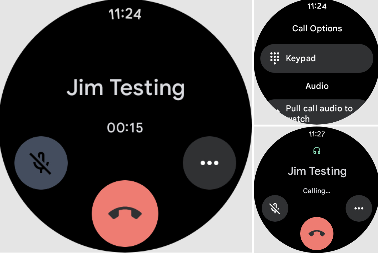 Изменения в пользовательском интерфейсе вызова включают перенос кнопки отключения звука и трёх точек меню в центральное положение — выше, чем было. Если раньше кнопка завершения вызова была таким же кругом, как и остальные элементы интерфейса, отличаясь только цветом, то сейчас она стала больше, и изменилась форма кнопки. На фоне круглого дисплея эта кнопка теперь смотрится выразительнее.