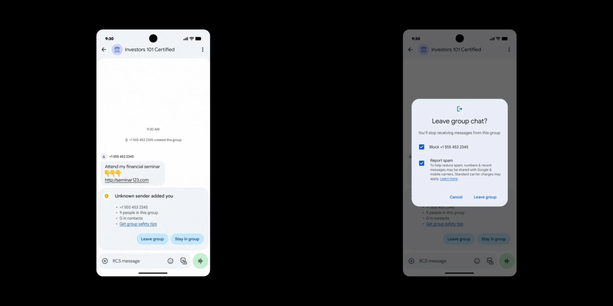 В «Сообщениях» появится удобный способ выйти из групповых чатов и сообщить о них, если пользователь получил приглашение с неизвестного номера. Над текстовым полем появится предупреждающая карточка: «Вас добавил неизвестный отправитель». В ней будет отображаться номер и общее количество участников чата. В сообщениях также будет указано, участвует ли в разговоре кто-то из контактов, а также ссылка на «советы по групповой безопасности».
