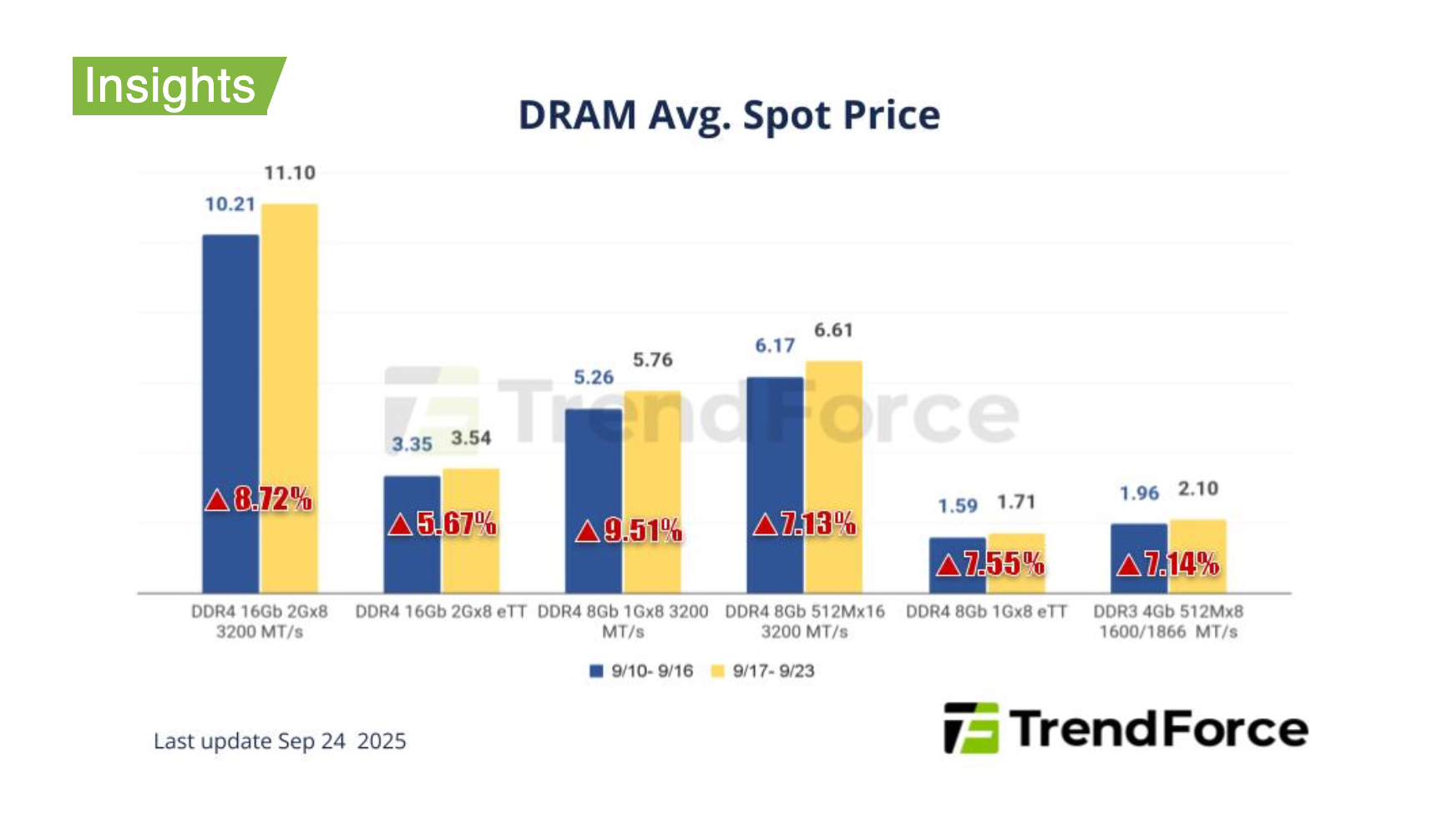 Из-за сокращения производстваОсобенно заметное повышение цен зафиксировано в сегменте DDR4. Согласно отчёту, средняя стоимость стандартных модулей DDR4 1Gx8 с частотой 3200 МТ/с увеличилась на 6,88% за неделю, поднявшись с $5,564 до $5,947.