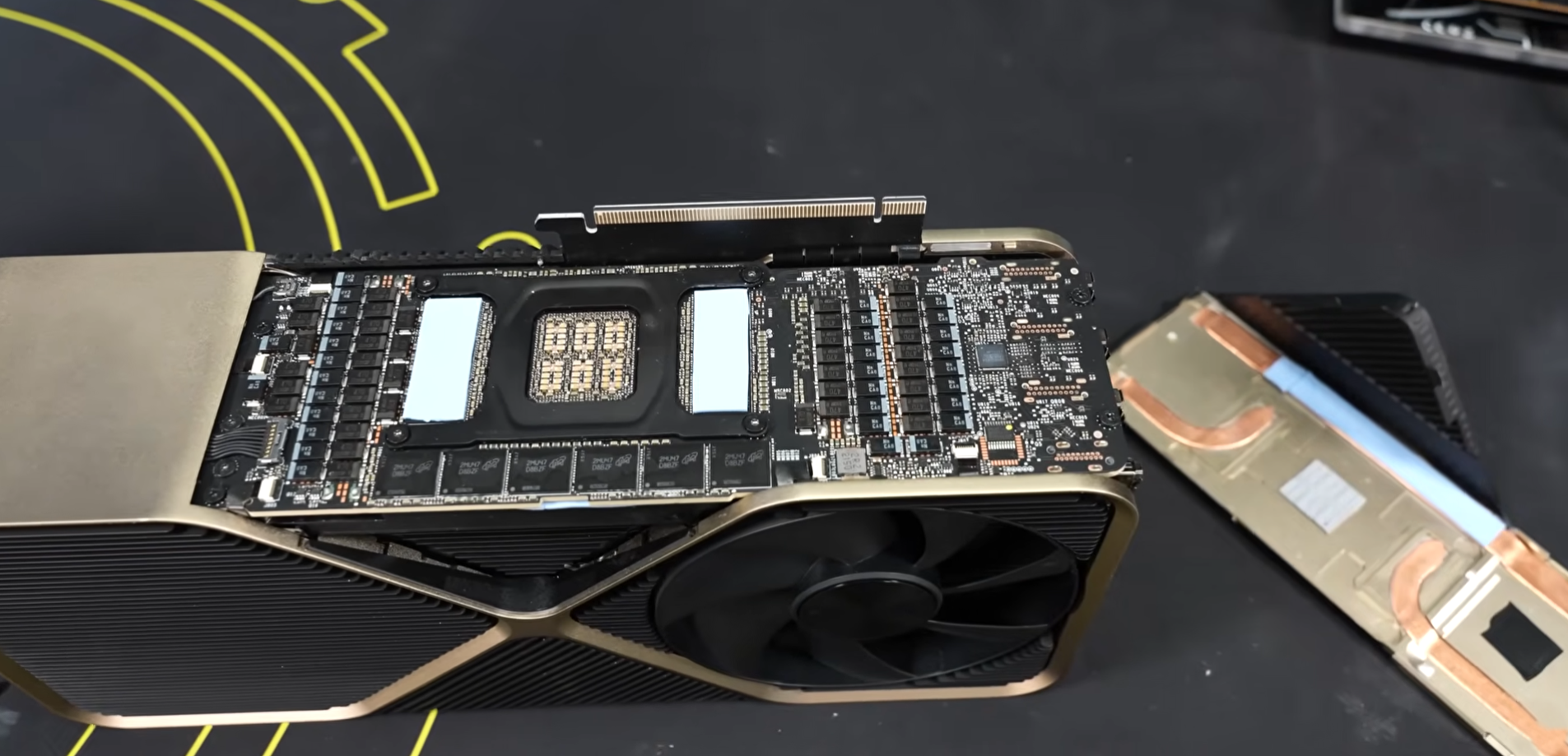 Вокруг GPU размещены 24 микросхемы памяти, по 12 с каждой стороны, что дает внушительные 48 ГБ VRAM. Охлаждение — монолитный радиатор с тремя вентиляторами и активной задней пластиной с тепловыми трубками.