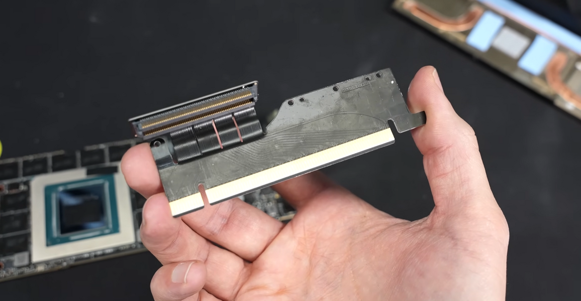 Основная плата с чипом AD102 расположена параллельно материнской, а подключение к PCIe реализовано через отдельную плату и гибкий шлейф — позже похожее решение появилось лишь в RTX 5090.