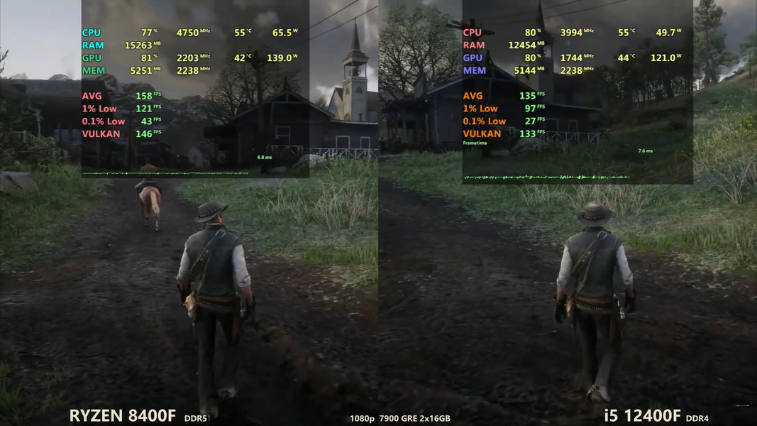 RDR 2 тестировалась с Medium Details. В среднем производительность в ней была на уровне 151 к/с (8400F) и 128 к/с (12400).