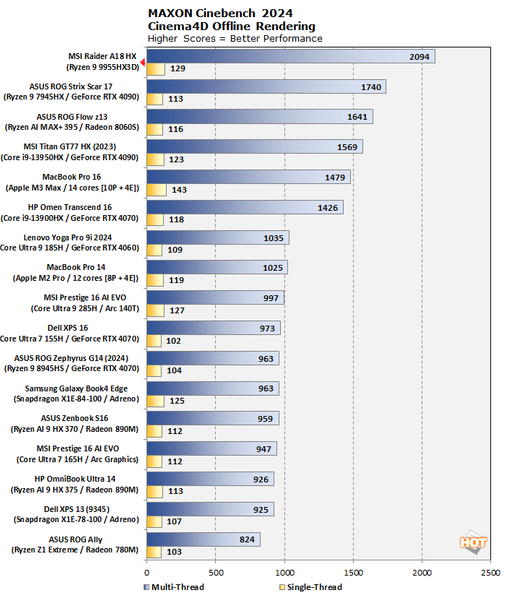 Ryzen 9 9955HX3D — это процессор с 16 ядрами, построенный на новой технологии Zen 5. Его особенность — дополнительная память 3D V-Cache на 64 МБ, которая помогает быстрее обрабатывать данные, особенно в играх. В тестах его проверяли на ноутбуке MSI Titan 18, возможно, с видеокартой GeForce RTX 5080 или 5090. В PCMark 10 он набрал 9706 баллов, немного уступив Ryzen AI Max Plus 395, но в single-core он обогнал всех. В Cinebench 2024 он тоже стал лидером.