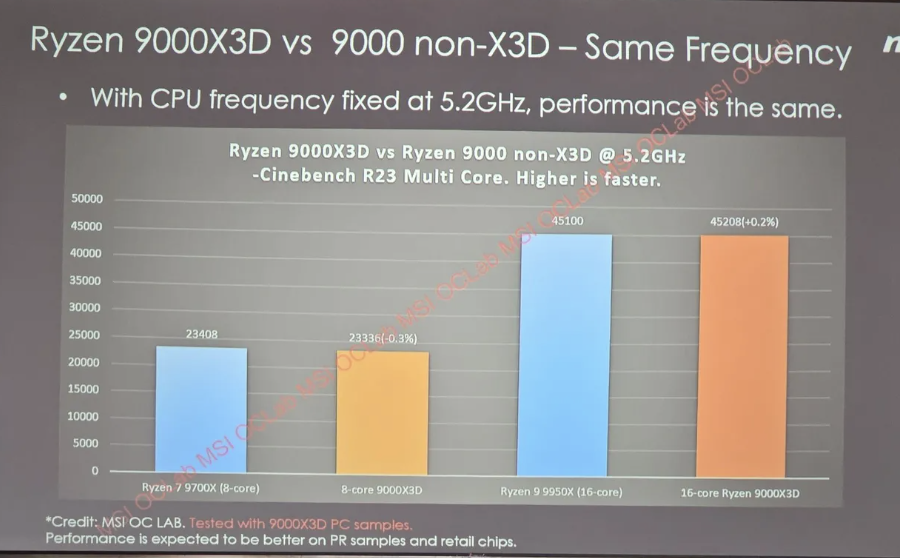 Данные MSI также указывают на то, что производительность Ryzen 9000X3D почти идентична обычной серии Ryzen 9000 при одинаковой частоте процессора. Хотя финальные версии чипов могут показать лучшие результаты, утечка вызывает вопросы.
