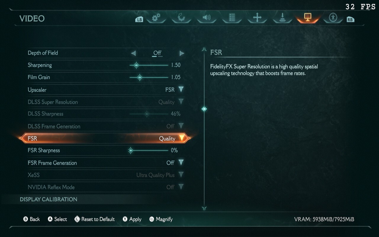 При разрешении 1280 × 720, отключенных Depth of Field и Chromatic Aberration и включенном FSR Quality, игра в большинстве сцен держит стабильные 30 fps. Иногда частота кадров поднимается до 42 fps, если поблизости мало врагов и текстур, но в массовых сражениях с десятками монстров она падает до 20 fps.