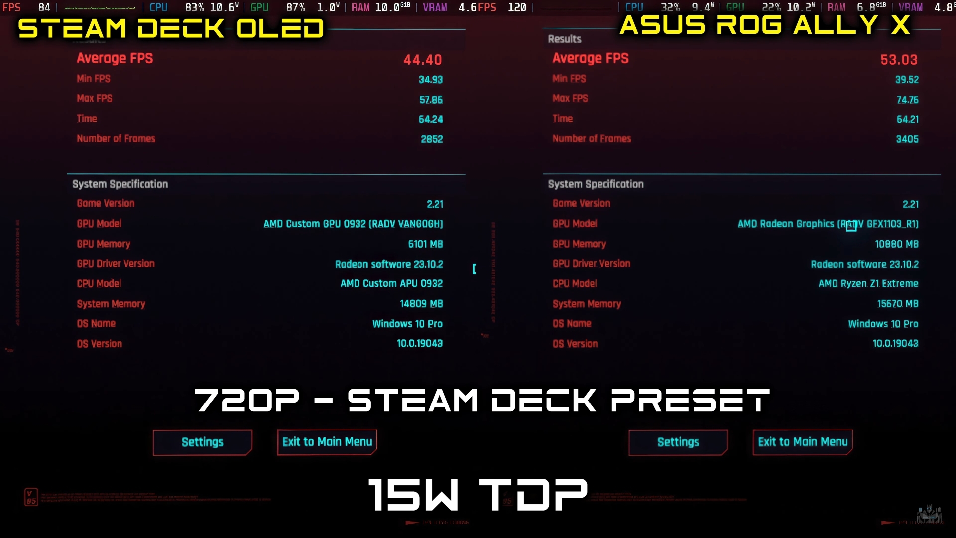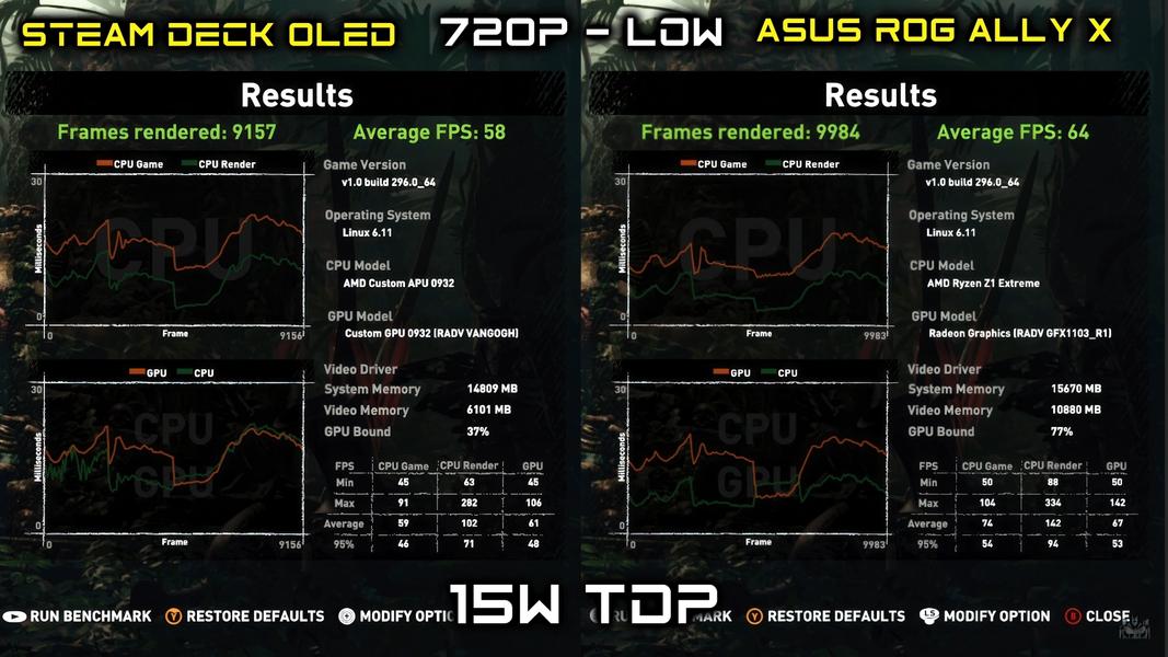 По умолчанию операционка от Valve ограничивает мощность ROG Ally X, но благодаря плагину SimpleDeckyTDP удалось настроить TDP вручную. Тесты проводились в равных условиях — при 15 Вт.