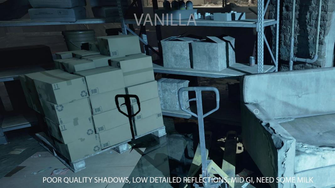 Модификация улучшает глобальное освещение, тени и отражения, делая их более плавными и реалистичными. Также доработаны солнечные лучи (God Rays) — теперь они выглядят детализированнее и кинематографичнее.
