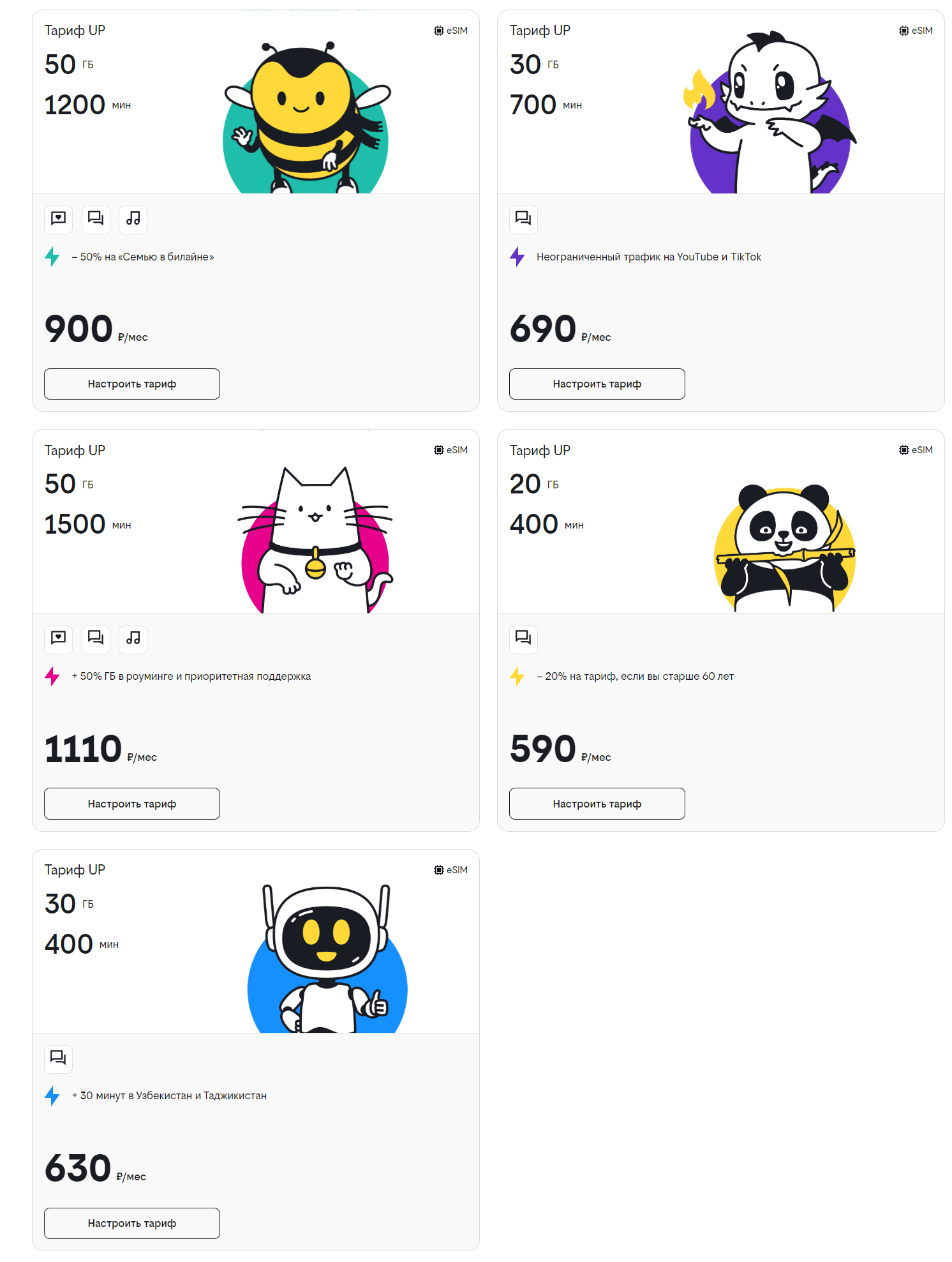 Который представлен пятью персонажамиКаждый персонаж имеет имя. Это пчела Базя, дракон Юнг, котик Пуш, робот Пинг и панда Тапа — каждый сможет помочь клиенту Билайна «прокачивать» свой тариф и ежемесячно получать дополнительные минуты разговоров, гигабайты интернета, скидки и специальные предложения. В целом тариф UP — это продолжение положительно встреченного 54% клиентов Билайна тарифа «Твоё решение» и сопутствующего ему слогана «На твоей стороне».