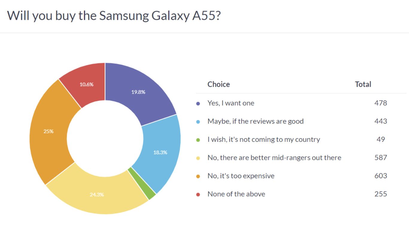 Четверть проголосовавших считают Galaxy A55 слишком дорогим. В комментариях люди пишут, что за те же деньги лучше взять Galaxy S23 FE. Это и понятно – круче железо, лучше материалы, а разница в стоимости несущественна.