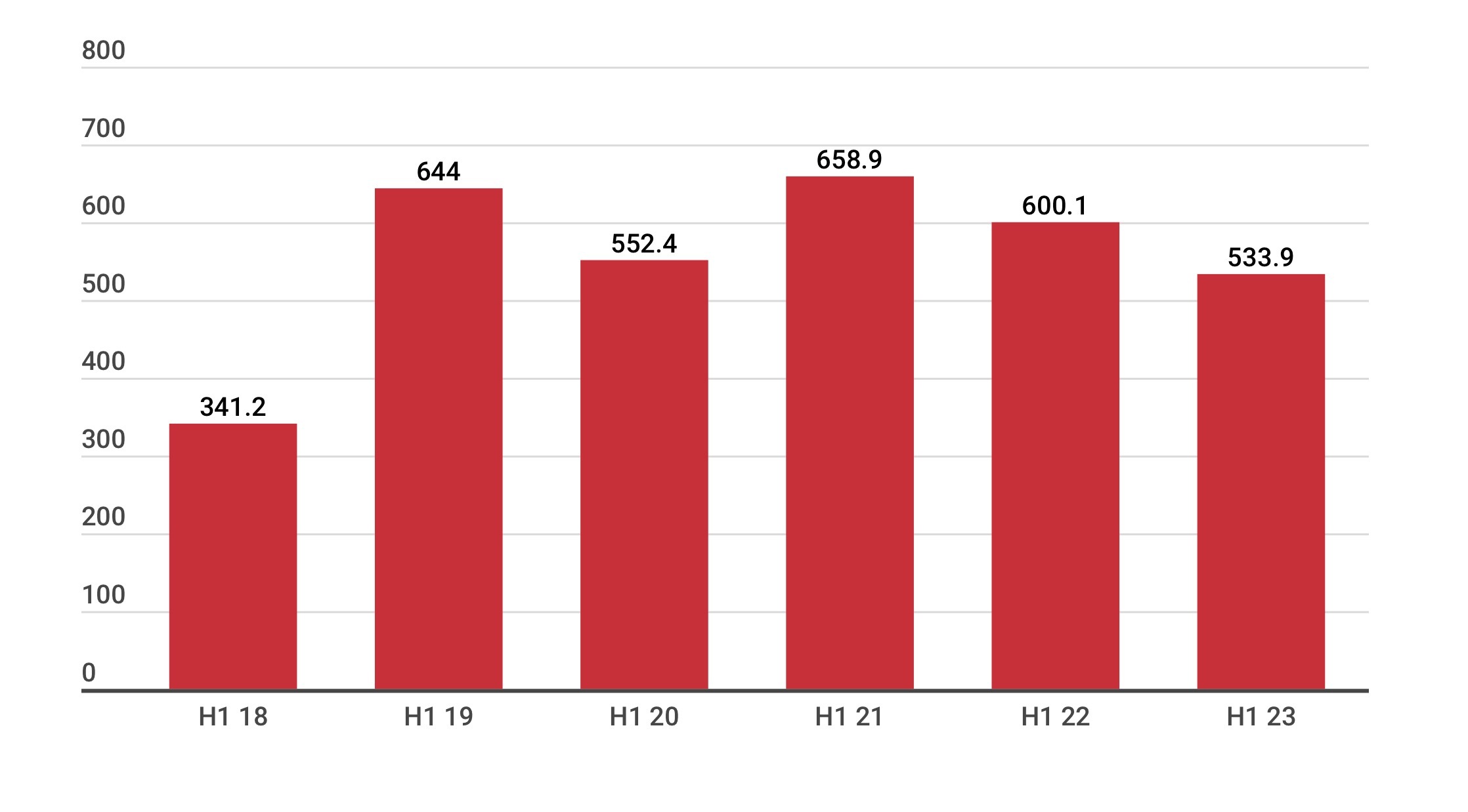 Однако в 2023 году зафиксировано ещё большее снижение спроса. По данным CasinosEnLigne, итогом первой половины 2023 года стало падение мировых продаж смартфонов на 11%, в штуках — 67 млн. В настоящее время количество проданных смартфонов по всему миру составляет порядка 534 млн штук.