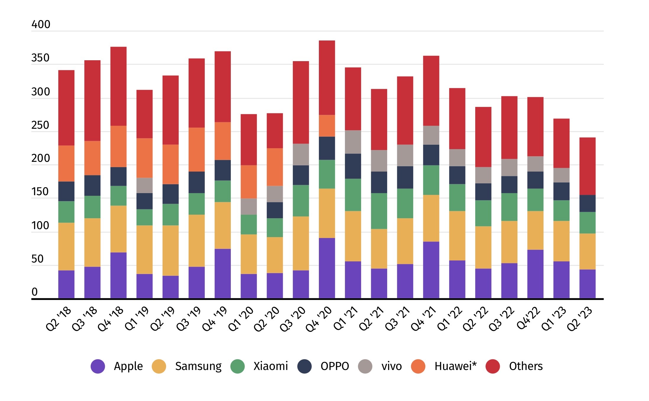 Xiaomi отгрузила на 20% меньше смартфонов — с 79,4 млн до 63,7 млн штук по сравнению с аналогичным периодом прошлого года. Согласно статистике, из китайских производителей, входящих в первую пятёрку, OPPO стала единственным производителем смартфонов, чьи поставки выросли в первом полугодии 2023 года.