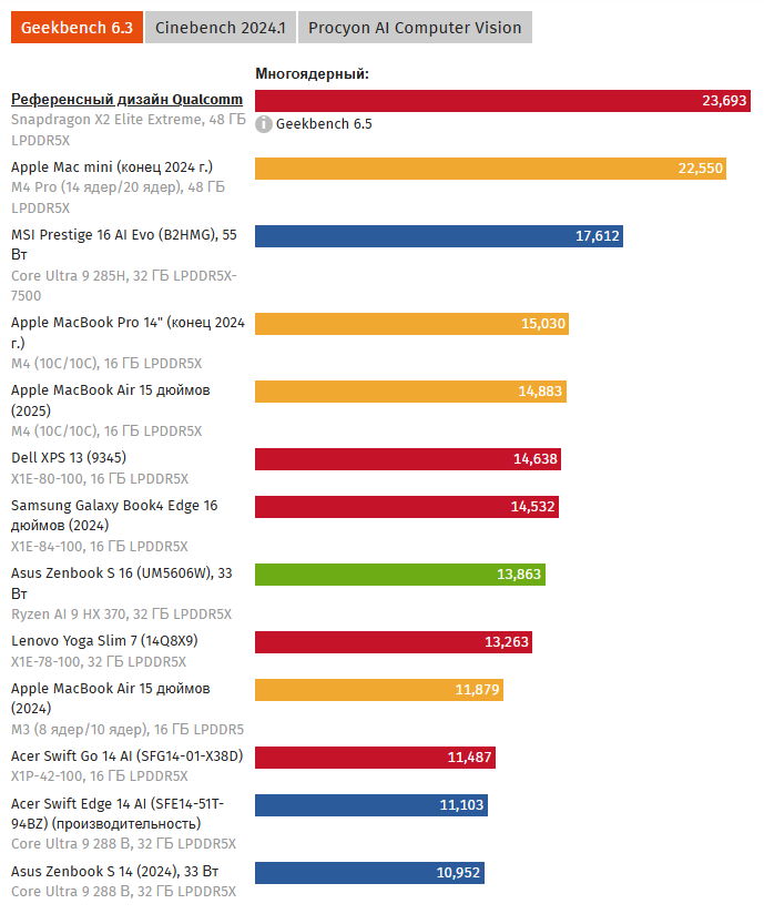 В Geekbench 6.5 он набрал 4072 балла в одноядерном режиме — на 7% больше, чем Apple M4 Pro, и на 36–44% выше, чем у решений Intel Core Ultra и Ryzen AI. В многоядерном тесте показатель составил 23 693 балла, что на 35% выше Core Ultra 9 285H и на 5% больше, чем у M4 Pro.