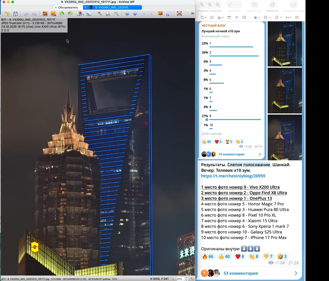 И Vivo победил с большим отрывомВ слепом голосовании в Telegram-канале участвовало 10 моделей смартфонов. Это Samsung Galaxy S25 Ultra, Sony Xperia 1 Mk 7, Honor Magic 7 Pro, iPhone 17 Pro Max, Pixel 10 Pro XL, Xiaomi 15 Ultra, Oppo Find X8 Ultra, OnePlus 13, Huawei Pura 80 Ultra, Vivo X200 Ultra.