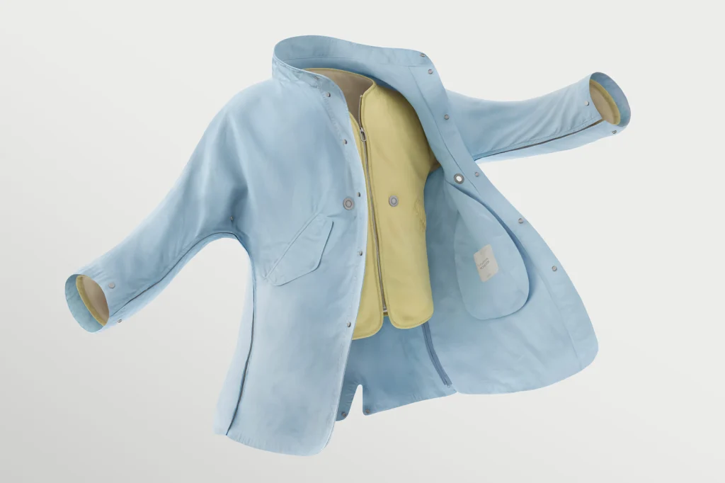 Центральным элементом коллекции является куртка «три в одном», сочетающая в себе жилет с пуховым наполнителем, известный как Moncore, и сменные внешние «слои», включая куртку, парку и пончо с капюшоном. Каждый слой изготовлен из единого, бесшовного куска переработанного нейлона, тщательно сложенного для придания ему формы.