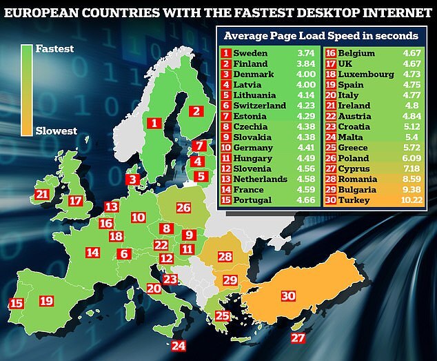 По скорости мобильного интернета Великобритания оказалась на 15 месте, настольного — на 17. Время загрузки британского интернета оказалось на секунду дольше, чем в лидирующих странах. Так, на первом месте во всех тестах оказалась Швеция.