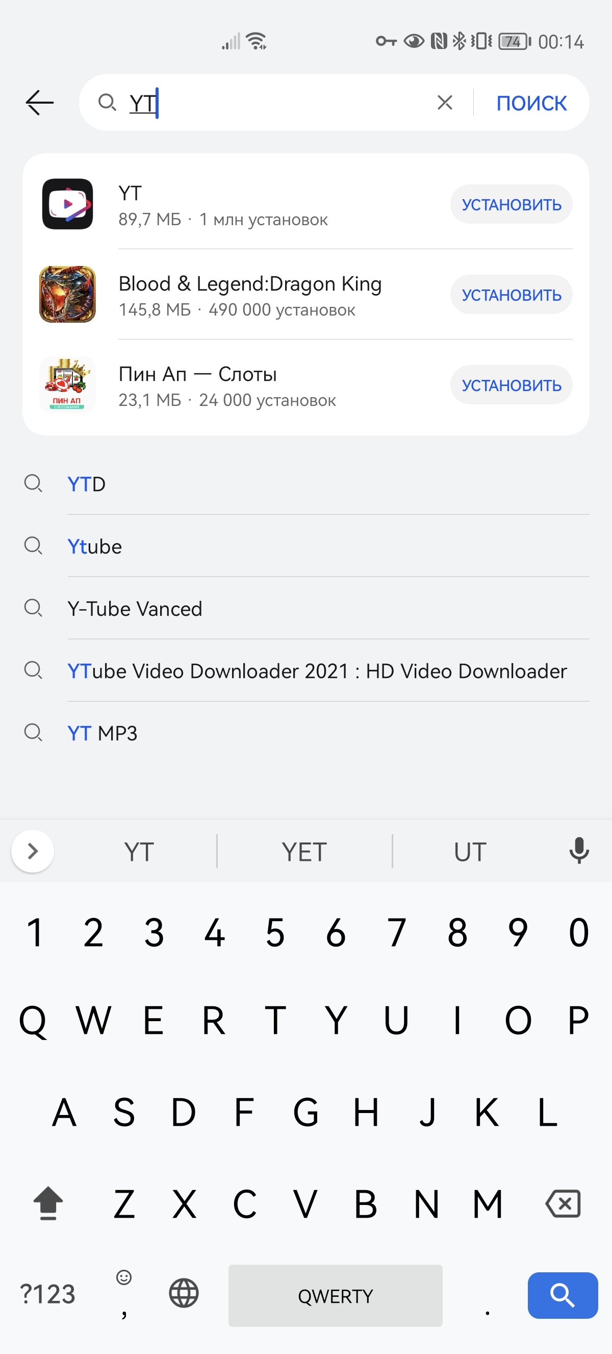 Шаг 1: Зайдите в App Gallery и введите YT в поисковой строке. Нажмите «Установить» и дождитесь завершения загрузки;