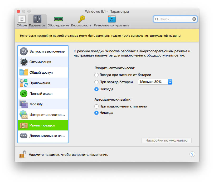 В новой версии ПО серьёзно поработали и над энергосбережением. Те, кто пользовался предыдущими версиями приложения, наверняка в курсе, что запускать Parallels Desktop без подключения к сети питания для Macbook подобно смерти: он начинал очень быстро разряжаться, и аккумулятора хватало ненадолго. Сейчас с этим стало получше, заряда моего Mac вместо 1,5 часов теперь хватает на 2 в смешанном режиме. Кроме того, есть специальный «Режим поездки», в котором отключаются некритичные для работы системные сервисы, что снизит нагрузку и увеличит время работы.