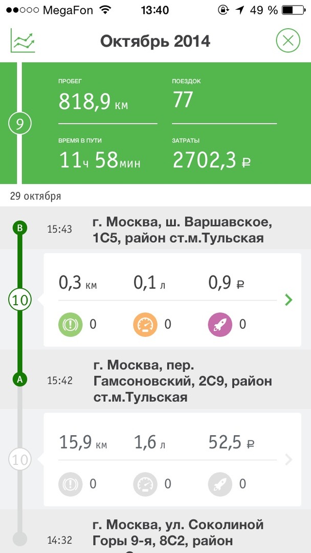 Приложение может показывать, сколько всего километров вы проехали, сколько времени и бензина потратили на этот путь. Более того: если ввести в программу данные о цене на топливо, то и общая стоимость бензина будет рассчитана.