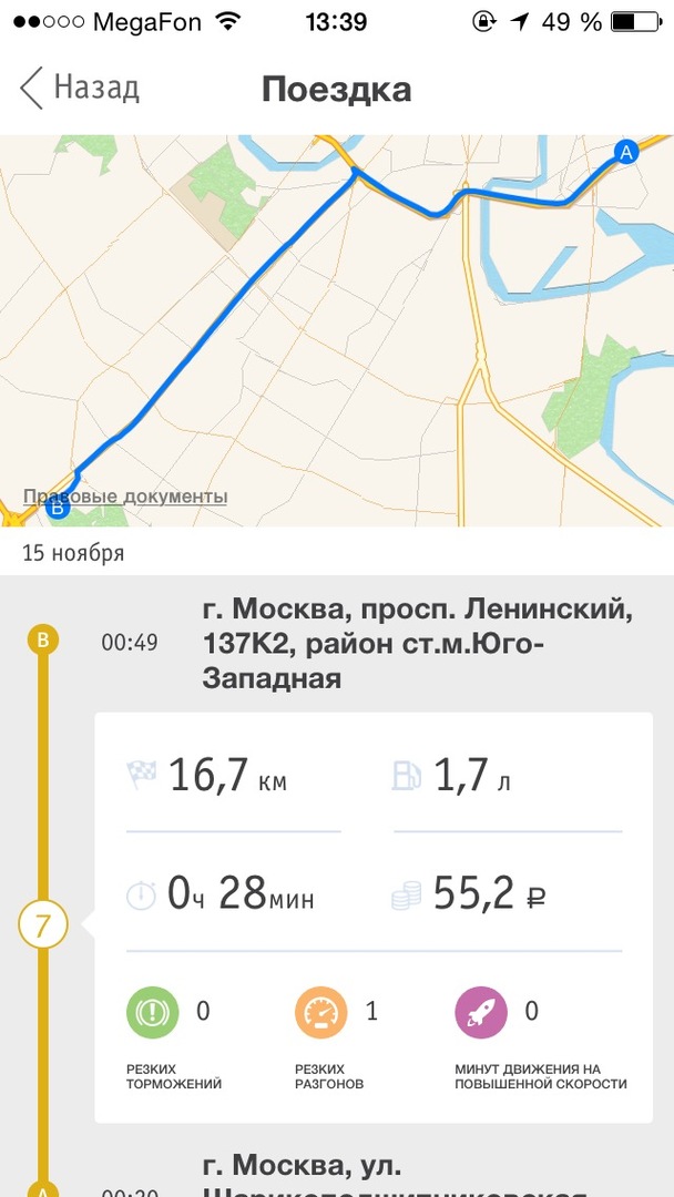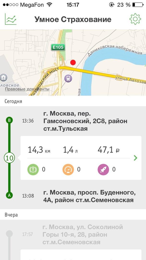 В приложении можно сразу же по завершении поездки увидеть, сколько баллов было заработано. Как видите, один резкий разгон снял у меня сразу 3 балла, а ведь таких разгонов или торможений может быть несколько. Так что приходится за собой следить, когда понимаешь, что можешь потерять деньги. И тут лучше помедленнее проехать, чем заплатить лишние 20% за и без того дорогое КАСКО.