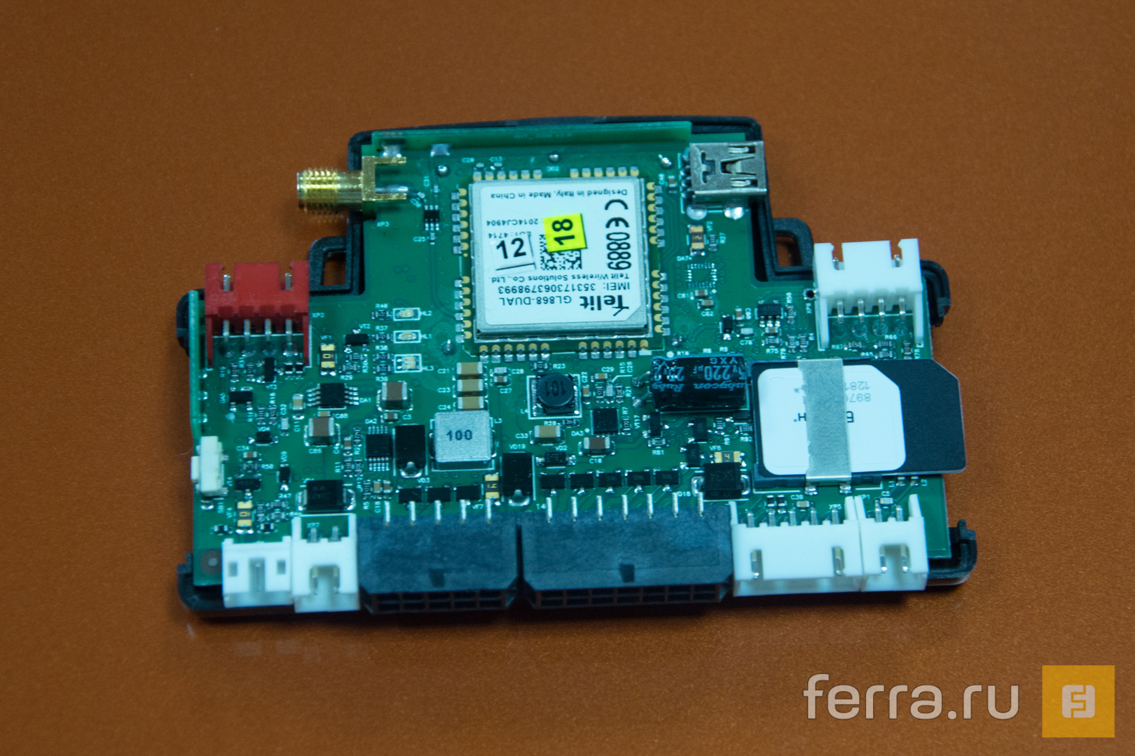 Разработчики уместили в этом блоке множество различных модулей, причём на плате они все расположены максимально плотно и компактно. Здесь находится процессор ARM Cortex M3 серии 200. Этот чип умеет работать с несколькими CAN-шинами автомобиля, что немаловажно, так как современные машины оснащаются уже не одной, а двумя и более шинами. Основной блок оснащён двумя CAN-драйверами и одним LIN-драйвером, который умеет работать с шинами предпусковых обогревателей Webasto и Eberspacher. В качестве оперативной памяти используется энергонезависимый сегнетоэлектрический модуль FRAM на 256 Кбит, а флеша здесь всего 64 Мбит. В блоке есть цифровой акселерометр для определения ударов и наклона автомобиля, а также датчик температуры, который используется для настройки параметров автозапуска. Оборудован основной модуль сигнализации также и GSM-модулем для передачи данных о состоянии и геолокации автомобиля на сервер компании. А уже оттуда сведения поступают в мобильное приложение и в онлайн-сервис, но о них расскажем чуть ниже. Ещё в блоке есть антенна и приёмопередатчик для радиосигнала 2,4 ГГц, который используется для связи с умными часами и брелоком.