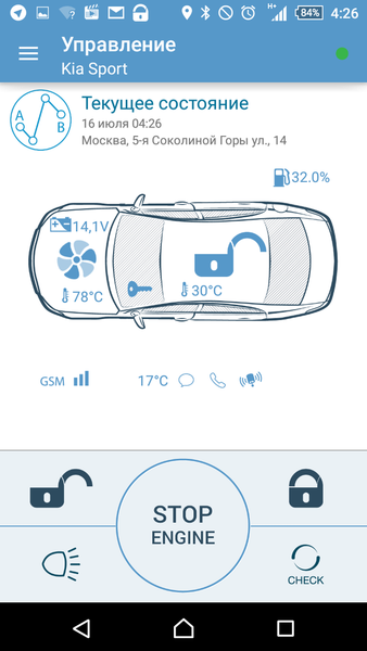 Программа умеет то же, что и онлайн-сервис, но использовать её намного удобнее. Основной экран тут содержит элементы для управления сигнализацией, а также телеметрические данные. В приложении доступна история и по каждому событию тут видно местоположение автомобиля и данные на тот момент.Из приложения сигнализацию тоже можно настроить, но количество параметров немного меньше, чем в веб-сервисе.