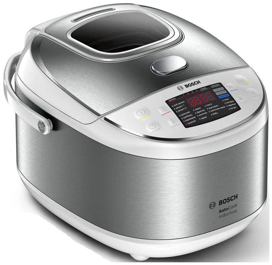 Долго же компания Bosch не выпускала мультиварок, зато как выпустила – так сразу индукционную. Модель по цене балансирует на грани: еще чуть-чуть — и уйдет из категории более или менее доступных. Два варианта цвета – серебристый и черный, мощность 1250 Вт, чаша 5 литров. От подруг по обзору ее отличает наличие электронной памяти: можно ввести в нее свои рецепты, присвоить им номера и потом готовить по ним быстрее. Еще один нюанс – окошко в крышке, но смысл его не очень понятен – все равно запотеет. Во остальном – почти все те же самые характеристики, причем тоже заявлено много программ (48), но надо учитывать, что это с подрежимами и настройками.