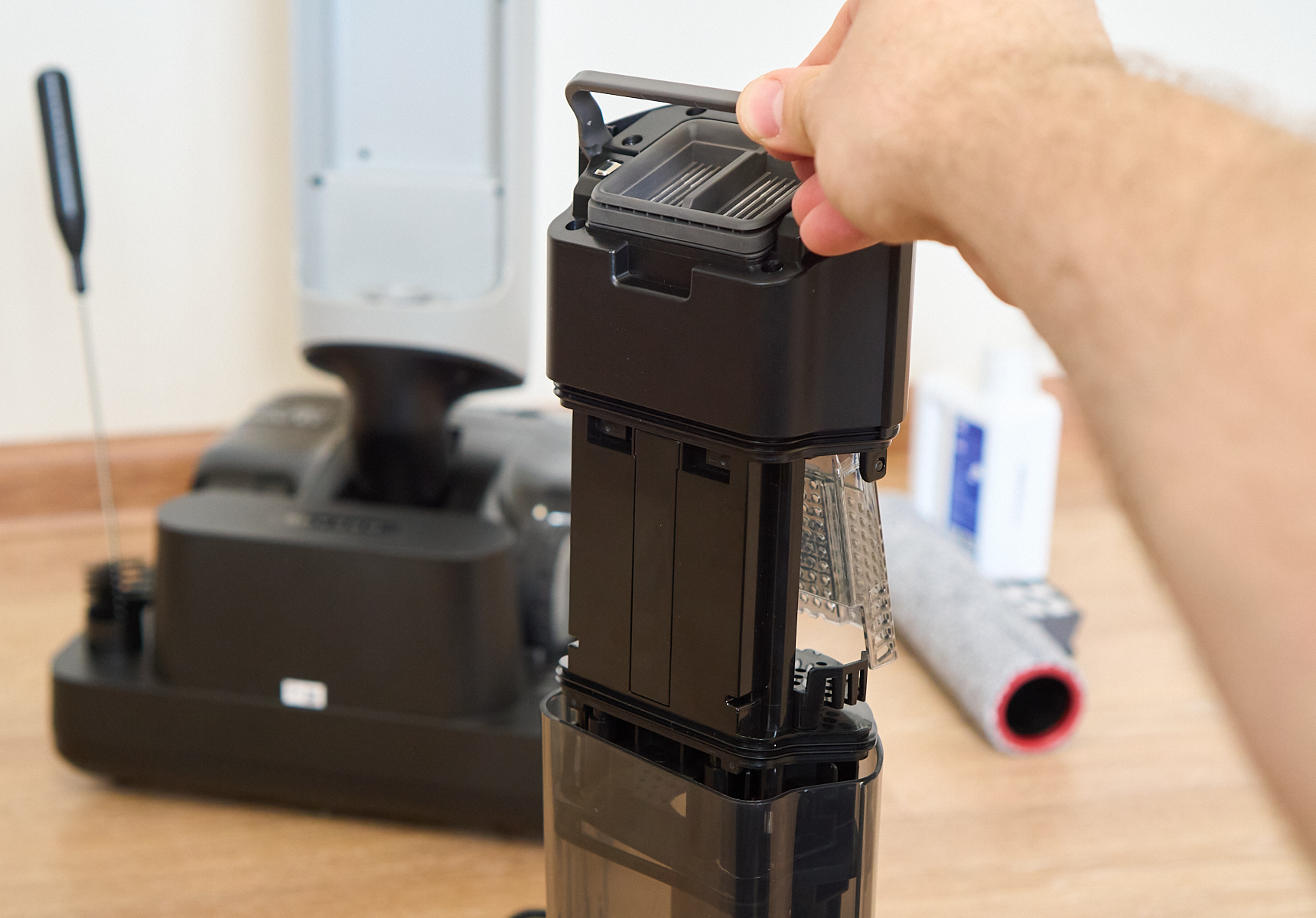 Как и раньше, для уборки снимаем пылесос с базы, приподнимая его. Делать это надо с усилием — он весит аж 6,2 кг.