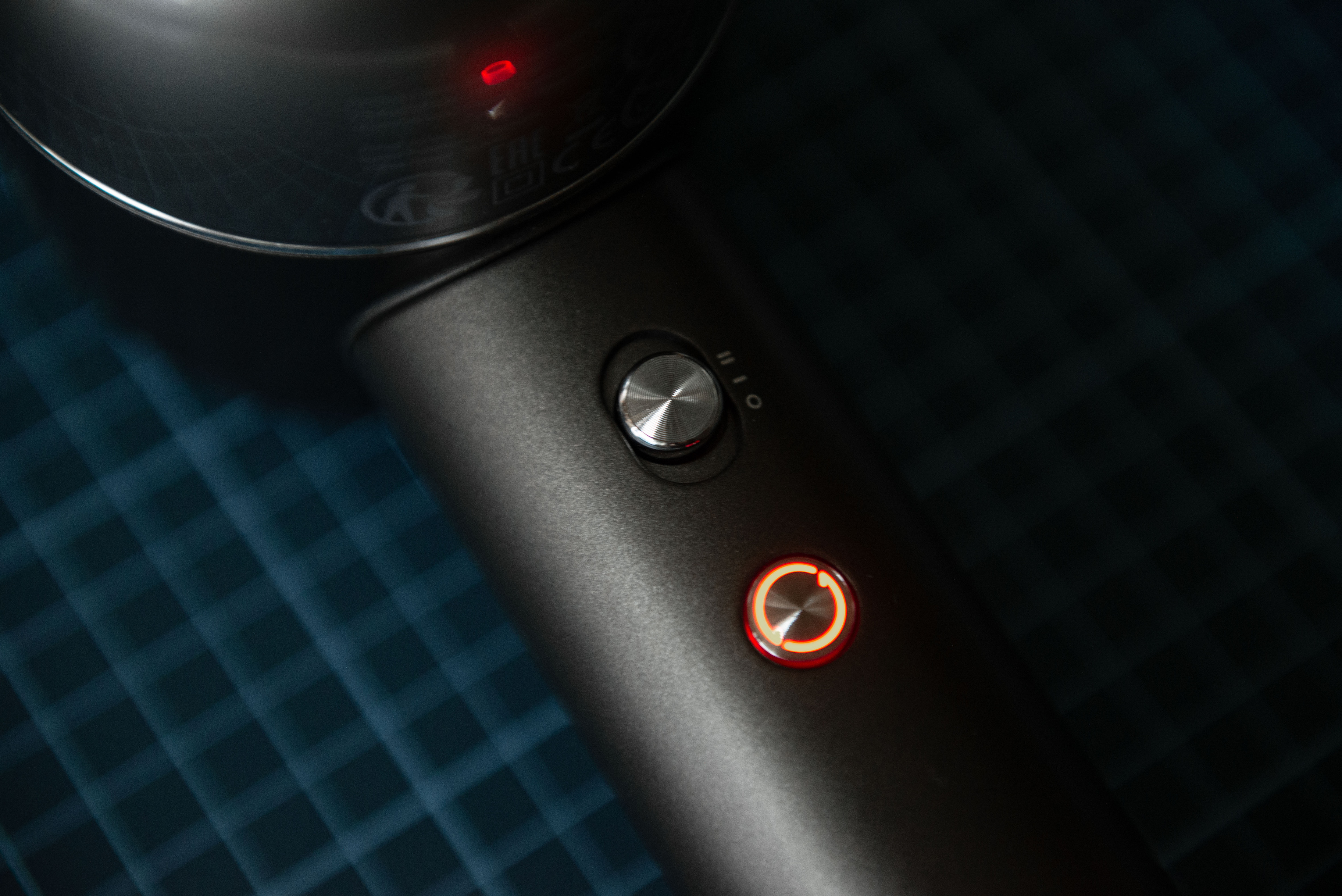 Индикация режимов на кнопке питания понятная. Светодиод горит красным? Это самый горячий режим для быстрой сушки тяжелых волос и создания укладки. Когда светодиод желтый, то температура держится на комфортном уровне — обычный теплый поток воздуха, который подходит для тонких волос. Белое же свечение сигнализирует о том, что воздух подается без нагрева.