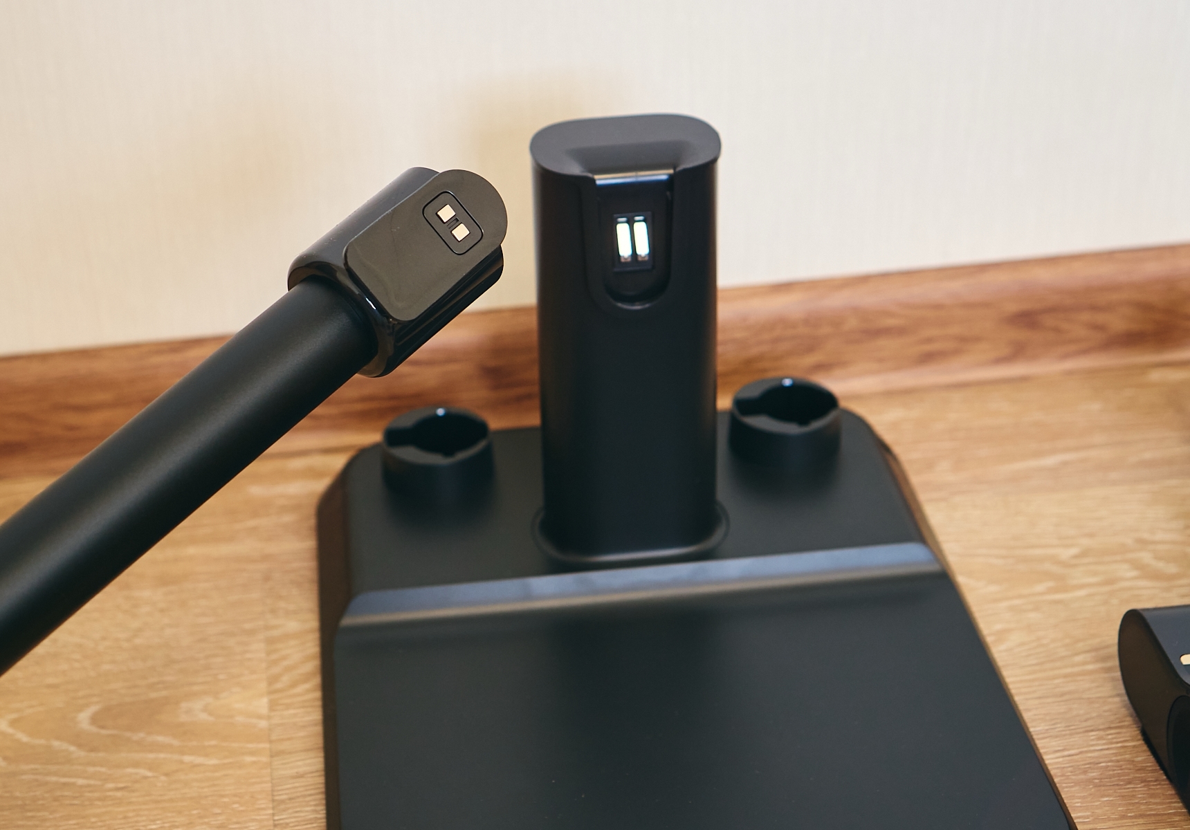 База — жёсткая, на неё пылесос устанавливается вертикально, хотя крепится внизу. Контакты зарядки проходят через базу, что правильно — никаких болтающихся проводов и никакой возни. Поставил пылесос на базу, подключённую к розетке — всё, он начал заряжаться.