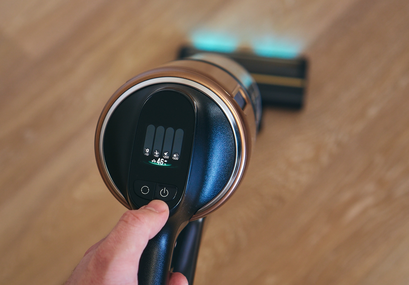 Отдельно стоит отметить цветной дисплей на моторном блоке. Он имеет относительно высокое разрешение (жду, когда энтузиасты запустят на нём DOOM) и может подробно показывать, в каком режиме сейчас работает пылесос, заряд аккумулятора, мощность всасывания, и т.п.