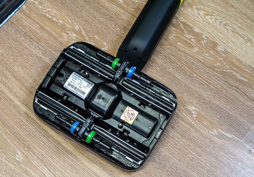 В процессе мойки валики орошаются водой из ёмкости и крутятся, засасывая грязь внутрь поломоечной машины, при этом за счёт щёток на контейнере для грязной воды — вся грязь с них в итоге попадает в этот контейнер. Karcher FC7 при этом может легко скользить, будто камень в кёрлинге. Т.е. чтобы двигать электрошвабру нужно прикладывать минимум усилий.