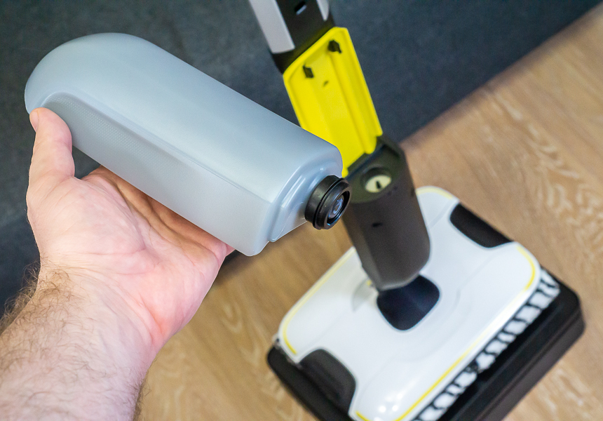 Ну и последнее — наливаем воду в специальную ёмкость. В воду можно добавлять моющее средство из комплекта, а можно не добавлять. Можно и специальный шампунь использовать (в комплекте есть бутылочка), но, опять же, для влажной уборки достаточно и просто обычной воды. Т.е. тратиться ли на спецсредства — дело ваше, смотря что вы хотите (нужна ли вам дезинфекция, например, или вдруг аромат какой-то желаете).