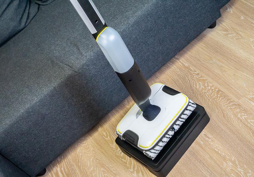 Дополнительно в передней части электрошвабры включается подсветка — она помогает находить пыль, а также "заглядывать" под диваны. По уровню шума Karcher FC7 тише любого пылесоса, однако спящего в той же комнате человека поломоечная машина, скорее всего, разбудит.