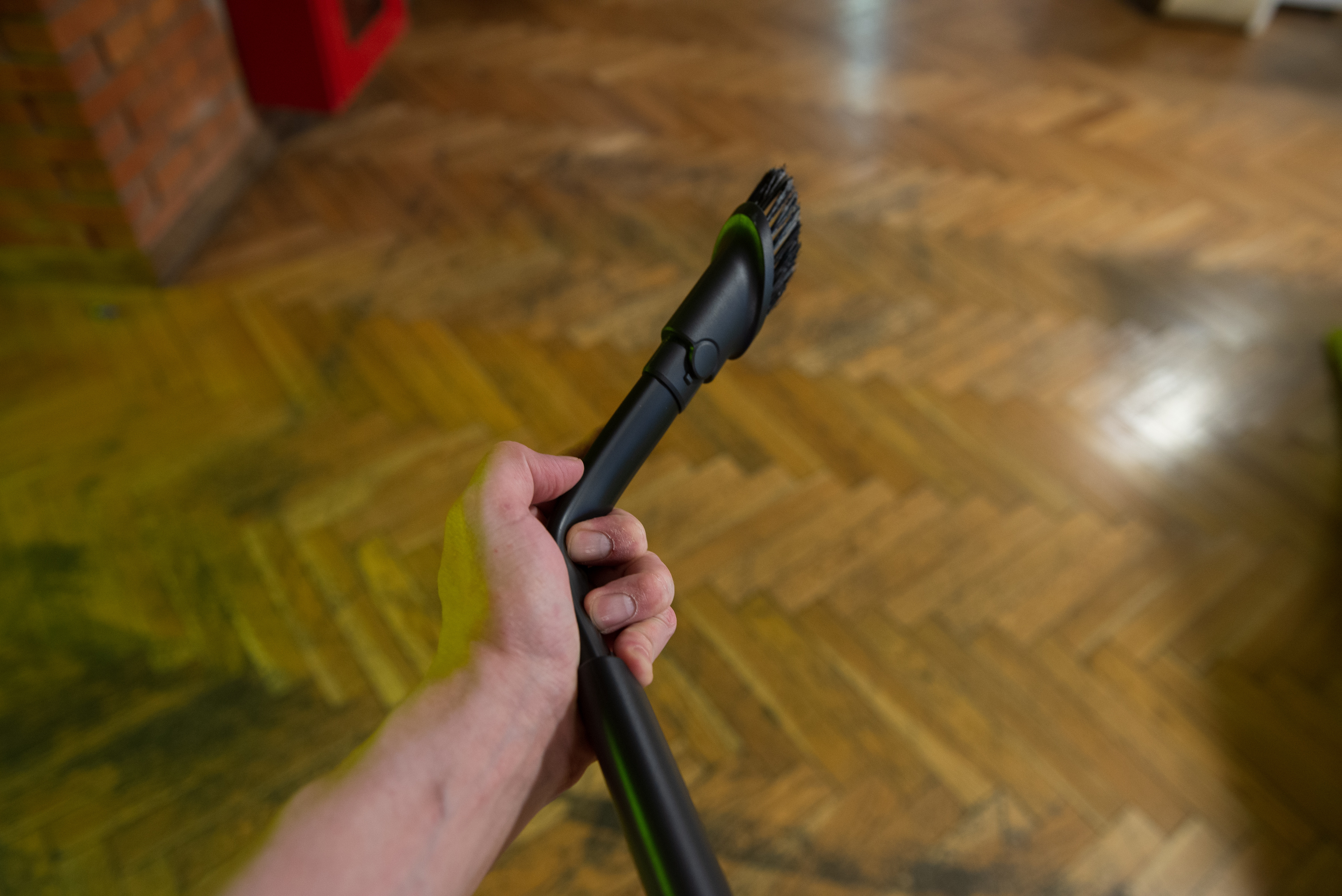 Для большего контроля над качеством уборки, а также для большего вау-эффекта, в основную моторизованную щётку добавили два светодиода. Начинают работать они сразу после нажатия на курок, выглядит всё это действо круто. Пыль действительно подсвечивает, поэтому да — это не бутафория, а вполне работающая «в полях» функция.