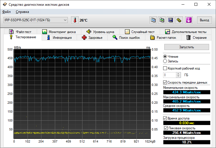 Бенчмарк HD Tune Pro является самым строгим по отношению к показаниям скорости чтения и записи данных. Ждать поблажек не приходится даже GOODRAM IRDM Pro gen.2 1TB, выступающему в классе топовых устройств. После нескольких прогонов результаты оказались следующими: максимальная скорость записи — 444 Мбайт/с, максимальная скорость чтения - 465 Мбайт/с. Тем не менее, обратите внимание на ровный график, на которым мы не наблюдаем резких проседаний и скачков скоростей. Увеличенный кэш и улучшенный контроллер отлично показывают себя на практике.