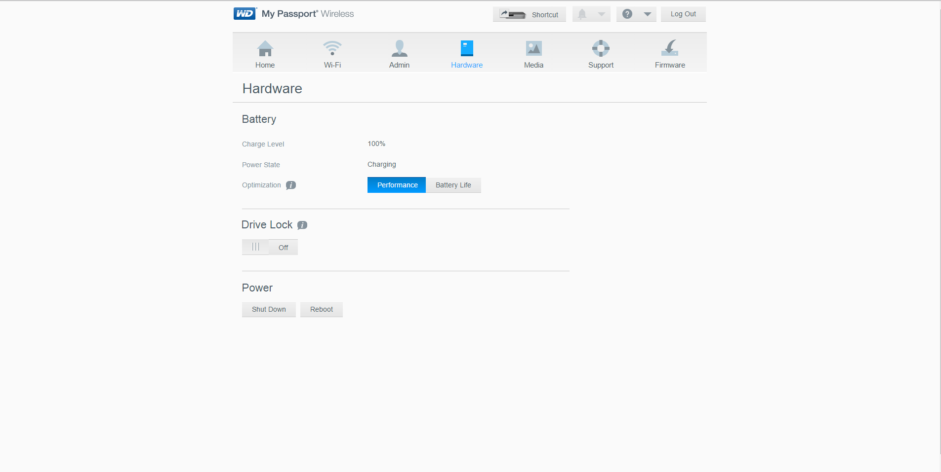 Раздел Hardware позволяет выбрать режим работы сетевого накопителя: производительный или экономичный. В этой вкладке можно заблокировать доступ к накопителю при помощи кабеля USB, а также перезагрузить и выключить устройство.