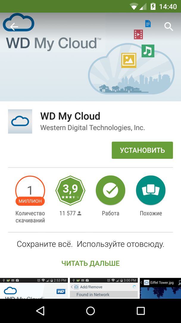 Для работы с My Passport Wireless при помощи мобильных устройств предусмотрено мобильное приложение WD My Cloud, доступное как для Android, так и для iOS. На момент написания обзора его скачали более миллиона раз. Средняя оценка — 3,9.