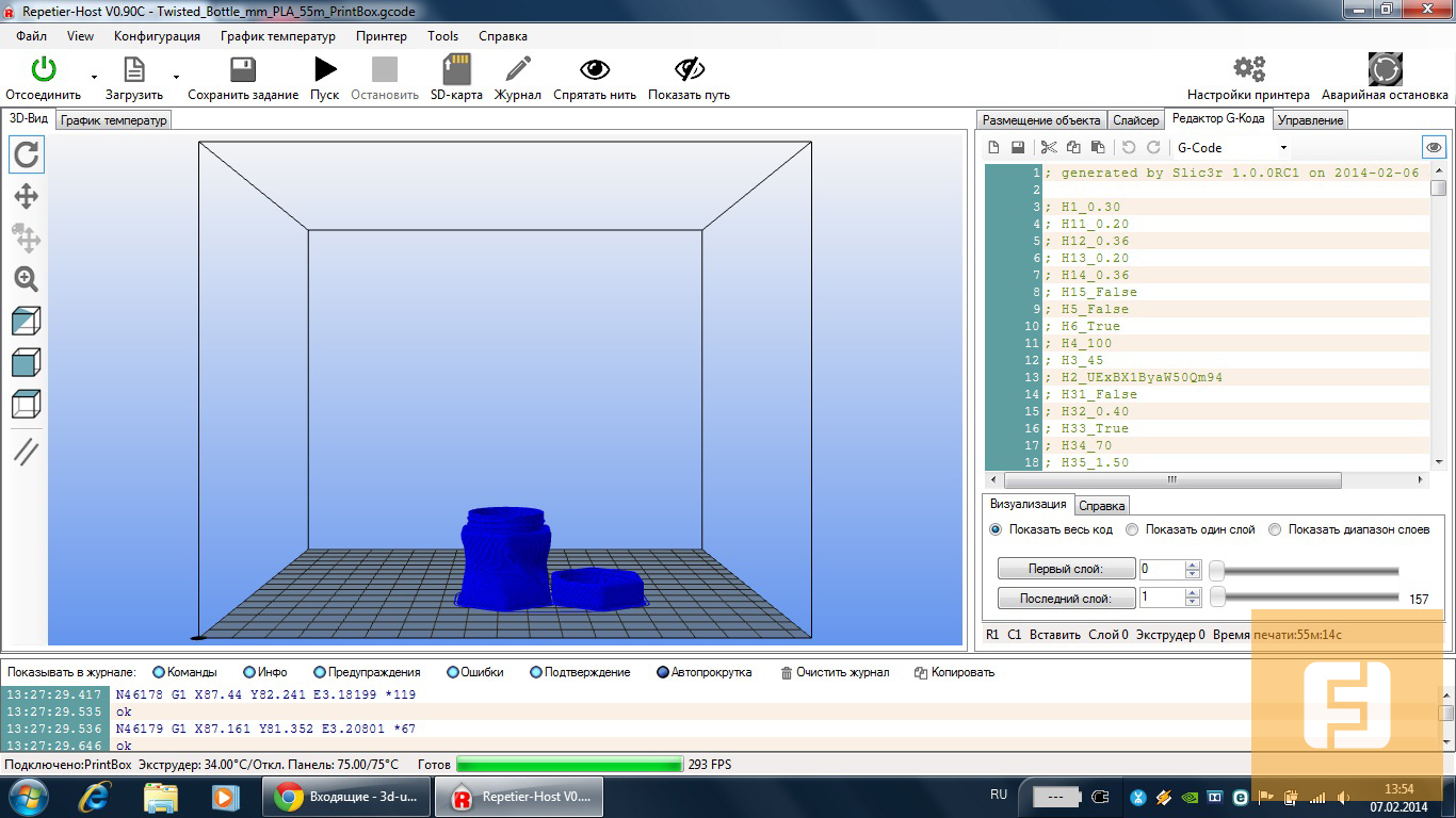 Подобно тому, как театр начинается с вешалки, работа с любым 3D-принтером начинается с создания 3D-модели. Для проектирования чертежа подойдет любая программа, которой вы умеете пользоваться. Это может быть AutoCAD, Solid Works, 3Ds Max, Rhinoceros 3D или ArchiCAD. Подойдут даже бесплатные Blender и Google SketchUp. Однако затем чертеж необходимо будет экспортировать в ПО, с которым работает сам 3D-принтер. PrintBox3D One взаимодействует с Repetier-Host, скриншоты которого приведены ниже. Отличительной особенностью этой утилиты является ее открытый исходный код. То есть владелец устройства может самостоятельно дорабатывать софт под свои нужды (при наличии навыков программирования, конечно же).