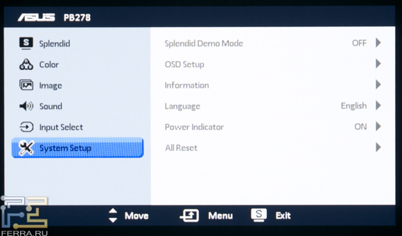 Далее идут настройки картинки, звука, источника видеосигнала и самого экранного меню. Мы не будем подробно останавливаться на этих пунктах, потому как они универсальны для каждого монитора и о них мы говорили в предыдущих обзорах мониторов ASUS. Скажем только, что русский язык в меню монитора поддерживается и его можно включить в пункте «System Setup».