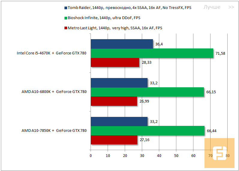 В разрешении 720p при высоких настройках качества графики ситуация не меняется: A10-7850K уверенно обходит своего предшественника, а Core i5-4670K замыкает тройку с некомфортными показателями FPS.