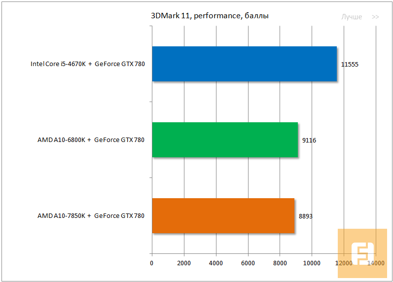 Все три участника демонстрируют примерно равный уровень производительность в компьютерных играх в разрешении 1440p при максимальных настройках качества графики. Однако лидирует Core i5-4670K. Особенно это заметно в тесте 3DMark 11.