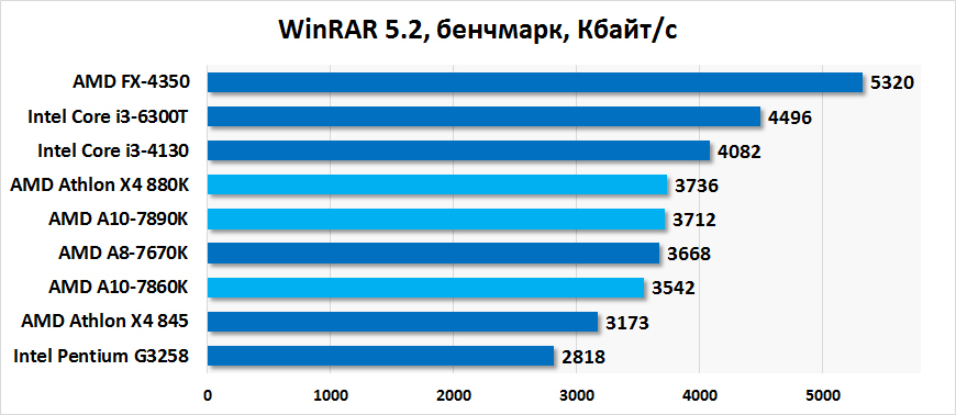 Перейдем к тестированию. WinRAR остро реагирует на отсутствие кэша третьего уровня у процессоров A10/A8 и Athlon X4. Поэтому FX-4350 просто выносит «в одну калитку» чипы для платформы FM2+.