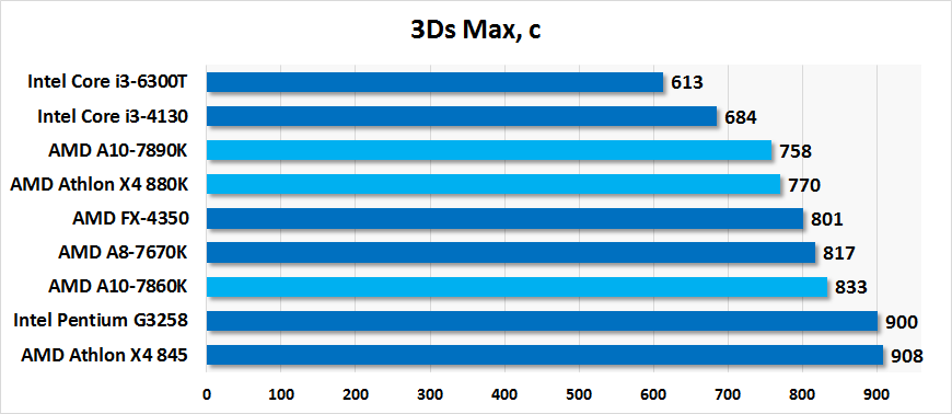 Рендер графики чипам AMD дается очень тяжело. Здесь гибридным APU конкурировать с Core i3 просто нереально. А ведь в сравнении используются низкочастотники! И в 3Ds Max, и в Blender A10-7890K и Athlon X4 880K оказываются стабильно быстрее FX-4350.